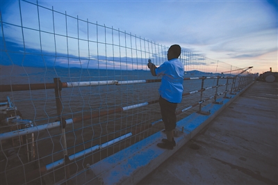 桥上手机信号不稳定,吃完晚饭的一位工人将手机伸到大桥护栏外,寻找信号给家人打电话。