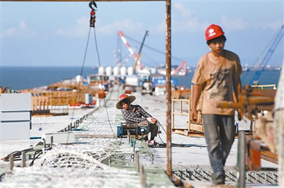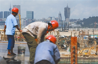 在珠澳口岸人工岛上,工人们头顶烈日在辛苦工作,几公里之外,澳门地标建筑新葡京酒店清晰可见,但对他们来说那里很遥远。