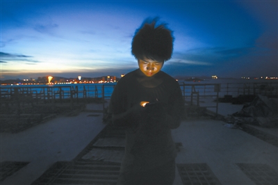 7月5日傍晚,四川遂宁的19岁小伙子何坤林在港珠澳大桥上用手机和朋友聊天。今年春节后他随父母来到工地成为一名建设者,大约一个月才上岸一次,没有时间打理的长发让他自我感觉“很酷”。每日劳作之后,玩手机是排遣寂寞的主要方式。