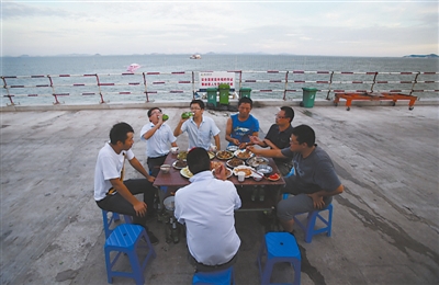 7月5日傍晚,珠澳口岸已是灯火辉煌,大桥上的工地宿舍只有海风阵阵,辛苦了一天的工人们一起吃饭,享受着难得的闲暇时光。周末聚餐,这是他们几年来坚持的一个传统,并会在每月中旬,为当月过生日的工友举行一个生日宴会,虽然只比平时多加了两三个菜,多了个蛋糕,但他们已经很知足。
