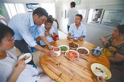 陈翔 ( 左二 ) 将湖北老家带来的辣椒酱送给工友尝鲜 。