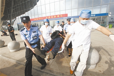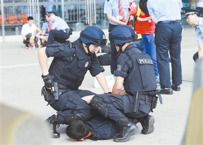 7月3日下午, “高铁2014”反恐实战演习在武汉展开。铁路(地方)公安、武警、工作人员、周边商铺人员及旅客群众近百人参加。