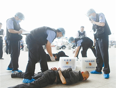 这次演习模拟暴恐分子在武汉站持刀袭击旅客,车站派出所值班员在视频监控中第一时间发现警情,第一时间用电台发出指令,驻站特警赶到现场,现场伤亡人员被送往医院救治。