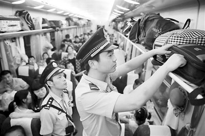 2014年铁路暑运开始后,杭州乘警支队充分结合暑运客流明显加大的特点,根据管内各次列车治安实际情况,加强危险品检查、旅客秩序维护、消防安全检查、流窜犯罪打击力度等重点工作,确保广大旅客群众暑运的安全出行。图为乘警加强列车安检。