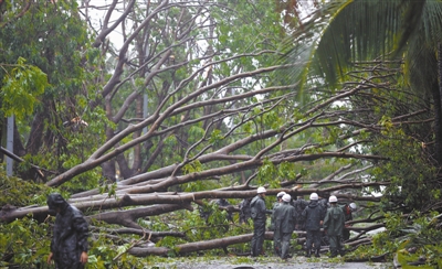 7月19日,海口消防官兵在海南省海口市滨海大道清理被台风刮断的树枝。7月18日,今年第9号台风“威马逊”以超强台风的“身份”在海南登陆。这场1973年以来登陆华南的最强台风过后,琼北地区满目疮痍,目前海南正抗灾自救。 新华社记者 赵颖全 摄