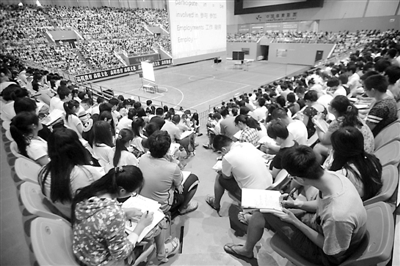 2014年7月16日,3500名“考研族”聚集在济南皇亭体育馆,听一个老师上“巨无霸”大课。放眼整个场面,显得十分壮观,这种3500名考生上大课的场面在全国少有。偌大的体育场内座无虚席,站立、正坐、倚靠、席地而坐、躺卧、蹲靠……黑压压的人群姿态万千。在场中央,一块异常醒目的巨型幻灯片幕布作为“大黑板”,抬头可见。