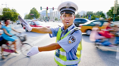 7月20日,山西省运城市盐湖公安交警大队四中队的一名交警在市区冒着高温指挥交通。