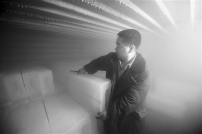 7月20日,江苏省扬州市,当日气温达到35摄氏度,闷热难耐。在该市一家制冰厂内,制冰的工人师傅却穿着棉大衣在零下10摄氏度的冷库里忙着运冰,干得热火朝天。孟德龙 摄