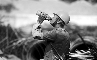 连续几天的高温,让扬州市变成一个巨大的“桑拿房”,就在人们想尽办法寻找清凉的同时,却有这么一群劳动者在烈日下挥汗如雨,坚守着自己的岗位。7月20日,一名建筑工人在喝水消渴。孟德龙 摄