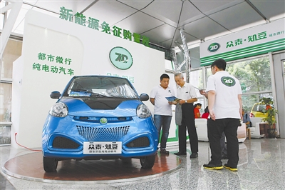 7月18日,重庆市民在一家纯电动汽车体验中心关注售价4.88万元的新能源汽车。