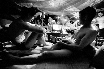 7月21日晚,浙江省杭州市萧山区市心路一工地棚里农民工们的度夏生活。当日,杭州最高气温达37.7摄氏度。张祥荣/CFP