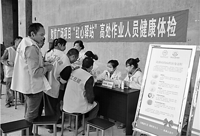 自2013年以来,流入江北区各非公组织和建设工地的农民工总量33.9万人。截至目前,“红心驿站”已组织农民工培训1.1万人次,发放上岗证5400余人,组织科技、法律、文化等宣讲活动及卫生义诊120场次,开展送教、送医、送法等活动1.8万人次,帮助农民工1.9万余人。图为农民工在“红心驿站”内参加体检。