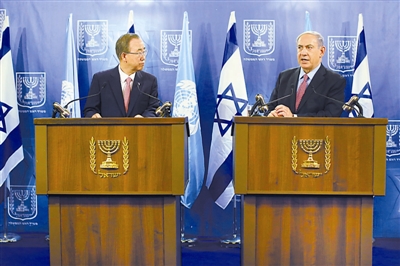 7月22日,在以色列特拉维夫,到访的联合国秘书长潘基文(左)与以色列总理内塔尼亚胡联合举行新闻发布会。