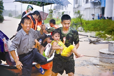 7月24日,在德安县宝塔乡,救援人员从冲锋舟上抱下一名小女孩。