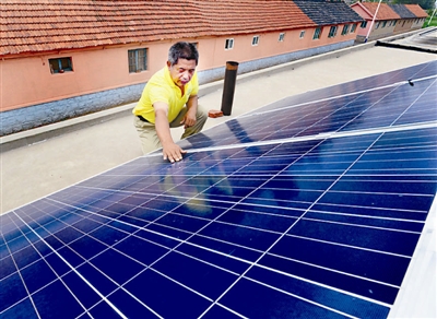 7月24日,在山东省即墨市普东中心社区,刘建国在村民屋顶上查看光伏发电设备。该市在普东中心社区梁家荒村70多户村民屋顶上免费安装了太阳能光伏发电设备系统。新华社发
