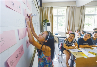 7月23日,一名参赛的孩子在拼写成语“眼花缭乱”。