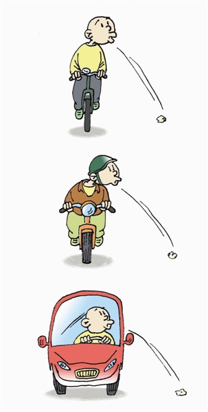 可以想象的是,乞丐吐一口痰,和国王吐一口痰,其影响及受关注度会有很大差异。同样的问题,骑自行车的、开摩托车的和驾驶小汽车的同样吐一口痰,给人们的视听冲击也会有巨大差异。更值得关注的是,这事在不同时间里出现在同一人身上。