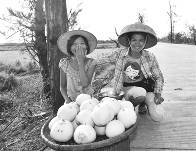 22岁的谢春丽和12岁的周亚梅是表姐妹,分别住在海口市三江镇山下园村和头脊村。强台风“威马逊”给她们的村庄造成了巨大破坏,村子现在无水无电,不少房屋倒塌。为减少台风造成的损失,两姐妹从22日开始坚持到公路边卖甜瓜。小妹妹周亚梅说,她们3天已经卖了8大箩筐甜瓜,接近300斤。台风灾害发生后,灾区群众积极生产自救,重建家园。 新华社记者 姜恩宇摄