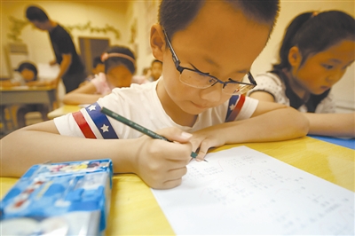 一名二年级小学生在暑期奥数补习班上解题(7月7日摄)。