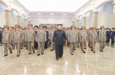 这张朝中社7月27日提供的照片显示,朝鲜最高领导人金正恩(前中)参谒平壤锦绣山太阳宫。锦绣山太阳宫是安放朝鲜已故领导人金日成和金正日父子遗体的地方。