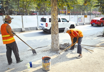 7月29日,在西安市长乐中路与康乐路交叉口处,工人在为被水泥封死根部的行道树“解封”。
