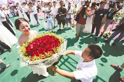 当日是七夕节,77对新人在辽宁沈阳市丁香湖举行公益集体婚礼。这77对新人是来自全市各个行业的优秀青年代表,他们在婚礼上筹集公益基金10万元,捐献给希望工程,希望通过这种形式倡导年轻人移风易俗、节俭办婚礼。新华社记者 潘昱龙 摄
