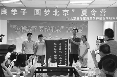 近日,北京嘉泽东博三叉神经医学研究院资助11名云南省昭通市彝良县地震灾区的中学生,到北京开始为期7天的“彝良学子,圆梦北京”夏令营活动,2年来,这11名学生一直得到该研究院助学金资助,图为同学们在开营仪式上向彭胜院长献上镶嵌着“医者援教,弘扬国之新风;仁心助学,谱写人间真情”的锦旗。笑阳摄