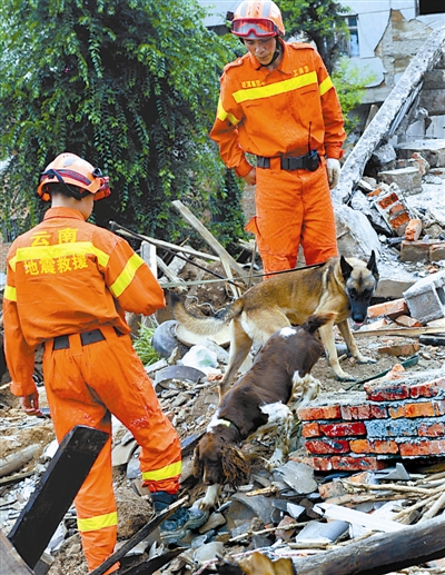 8月4日,救援人员携带搜救犬在龙泉社区一片倒塌民房的废墟中寻找生命迹象。