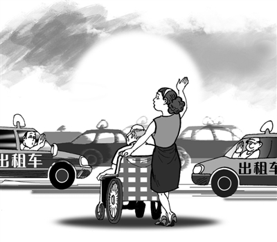 据《北京晚报》报道,近日,北京的赵女士推着坐轮椅的父亲从朝阳医院出院,在朝阳北路招手打车时,却被挂着“空车”牌的出租车“无视”。等了40多分钟,眼前驶过大约20辆空车后,赵女士和父亲才坐上出租车。此时,父女俩已满头大汗。