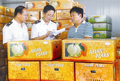 8月5日,河北沧州出入境检验检疫局工作人员在泊头市一家梨果加工企业对出口的鲜梨进行检验。