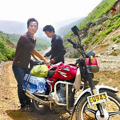 罗文(左)和表哥载着矿泉水和蔬菜在回乡路上。