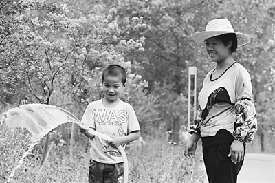 7月29日上午,湖北丹江口市凉水河镇一年级小学生马均宏,在妈妈劳动的丹江口大坝下游城区汉江段沧浪洲生态湿地公园里,按照妈妈的指导给花草树木浇水。他来妈妈打工的地方有一个月了,妈妈负责给公园的花草浇水,每天工作10个小时,可领到80元;爸爸在市区建筑工地打零工,每天挣一百多元;姐姐开学上高三,暑期在学校补课。