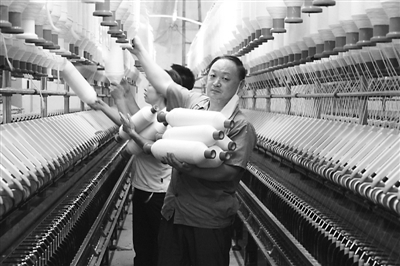 图为众信纺织厂男性农民工上岗一角。(杨海鹏 摄)