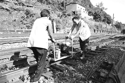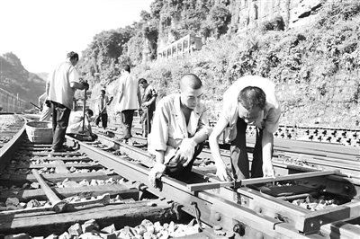 在这支队伍中,一对父子组合引人注意。52岁的父亲黄召强,有20多年的工作经验,已是养路工中有名的“把头”(工人对技术好的养路工的尊称)。25岁的儿子黄代斌,是工区最年轻的养路工。阳光炙烤下,枕木上的沥青被晒得发烫,负责捣固的黄代斌每挥舞几下铁锤,便要抬脚跳上几下,不然脚底便会火辣辣地疼。负责测量道轨距、水平等数据的父亲,沉着的拿着道尺、轨道支距尺等工具,时时趴在铁轨上测量,脸颊常常碰着滚烫的铁轨,手上仍动作不停,量尺、计算一气呵成。