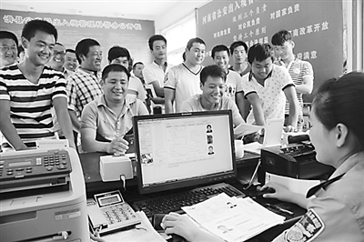 图为河南省滑县公安局出入境管理民警正在为高平镇36名准备前往印度尼西亚的的中青年建筑工集中办理护照,并向大家认真讲解有关出国务工安全防范注意事项。张波/CFP