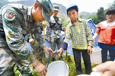 鲁甸地震发生后,重灾区云南省巧家县新店镇坪地村水渠被毁,水窖震裂。除了救灾矿泉水,受灾群众已“断水”多日。7日,第13集团军某红军师官兵在离村子约5公里处找到水源,从半山腰引出水管。8日,“自来水”流到了集中安置点,大大缓解了受灾群众的用水困难问题。 新华社记者 陶亮 摄