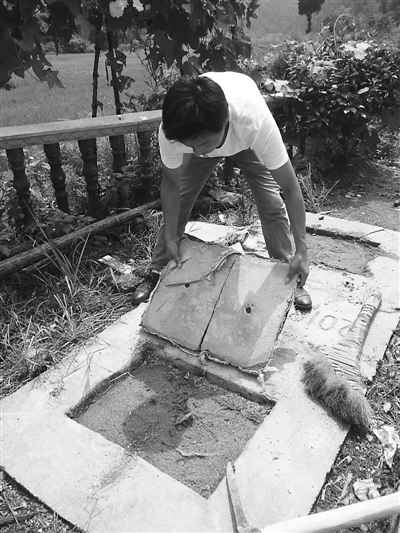 2014年8月6日,江西九江武宁县东林乡东林村一组,很多人家的房前屋后,地上都盖有统一规格的化粪池水泥盖。而撬开“化粪池”的水泥盖子,下面就是地面,没有池子。
