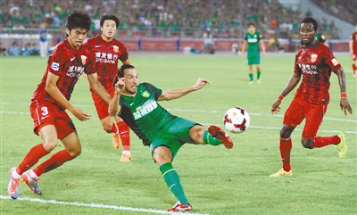8月10日晚,在中超联赛第19轮比赛中,北京国安主场2比0战胜上海上港队。图为国安外援德扬射门。本报记者 许之丰 摄
