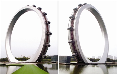 2014年8月10日,江苏常州。号称“世界最大、国内唯一”的时来运转无辐式摩天轮,是常州地标性建筑,耗资约1.5亿元。该摩天轮自2010年初开建以来,至今仍未投入运营。有市民质疑,政府用巨资打造的摩天轮形同摆设。