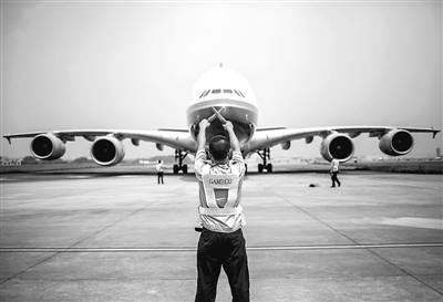 7月31日中午12时45分,一架从北京飞往广州的A380客机降落后,缓缓驶入停机坪。