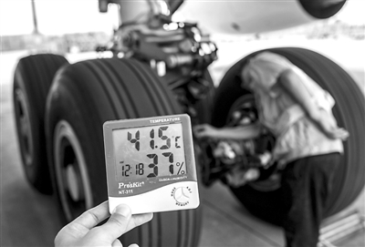 当飞机停稳后,空调车迅速开近,两名工作人员用长管子对着飞机轮胎吹冷气降温。在高温天气下,飞机降落刹车,轮胎温度最高可超过450℃。