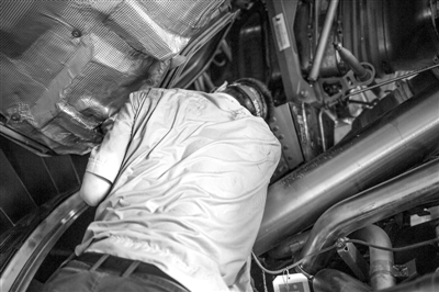 一名工作人员钻入巨大、闷热的飞机引擎检修零件。很快,他便已浑身湿透。