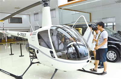 8月11日,市民在中欧飞机公司杭州展厅观看美国罗宾逊公司生产的R22型单发直升机。