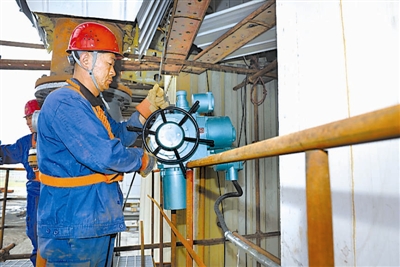 8月12日,在宁夏回族自治区马莲台电厂,工人在新安装的径流式电除尘器外部进行施工检测。