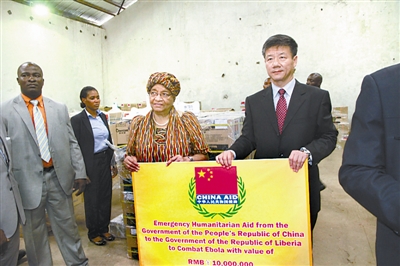 12日,在利比里亚港务局驻地,中国驻利比里亚大使张越(右一)向利比里亚总统瑟利夫(右二)正式移交救援物品。当日,中国向利比里亚提供抗击埃博拉疫情紧急人道主义援助物资交接仪式在港务局驻地举行。新华社发(高斌 摄)