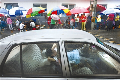 8月13日上午,北京,一位排了一宿队的居民在车中休息,他的儿子接班在车外排队。