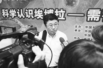 8月12日,中国科协主办的“科学家与媒体面对面”系列活动邀请来自中国疾控中心的三位专家,举办题为“科学认识埃博拉——需警惕、莫恐慌”的科普活动,讲解埃博拉病毒的起源、传播方式、易感人群和个人防护的方法等知识。图为中国疾控中心病毒病所副所长董小平在会后回答记者提问。新华社记者 张玉薇 摄