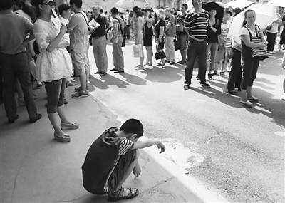 火爆的小升初报名现场,孩子和家长都疲惫不堪。资料图片