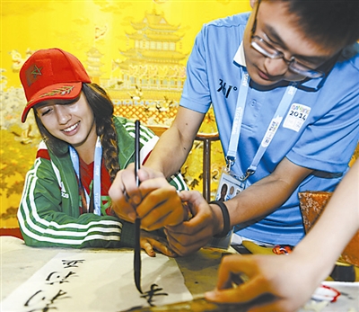 当日,位于青奥村里的中国文化小屋首次与世界各国的青奥健儿见面。在文化小屋里,大红灯笼、古筝演奏、剪纸、中国结、书法等“中国元素”齐聚一堂,让来自世界各地的运动员感受中国传统文化和南京非物质文化遗产。