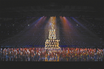 仔细观察,这座“筑梦之塔”是由上百名身着表演服装的青少年完成的。据了解,他们都来自河南少林塔沟武校,与青奥会的运动员参赛年龄一样,他们也都是15~18岁的青少年。随着现场音乐和灯光的变化,由地面300人、空中120人组成的“筑梦之塔”时而打开,时而聚拢。而在塔尖的上方,一个圆盘形的威亚装置成为这个节目的关键所在。